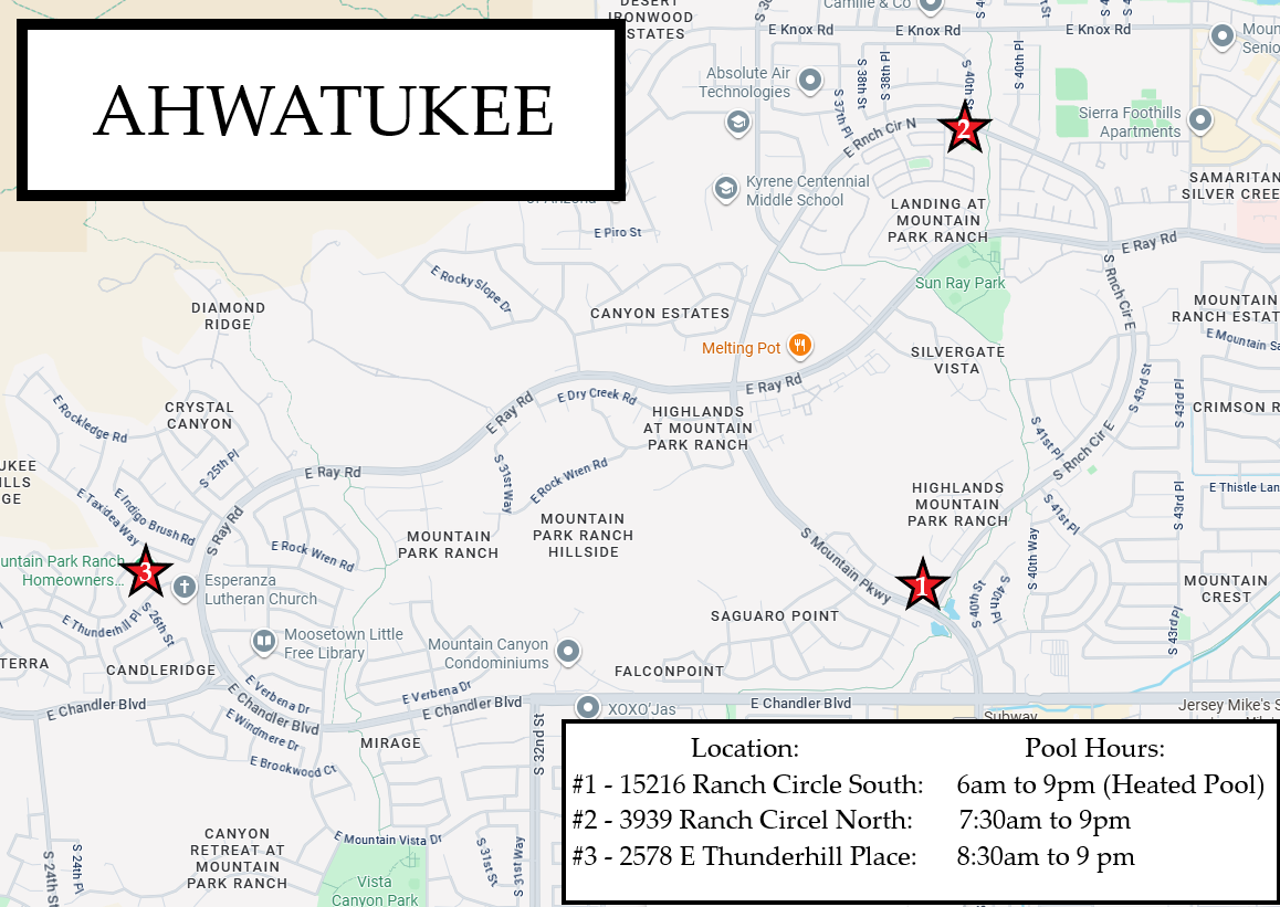Mountain Park Ranch covers almost 3000 acres and is made up of a master association with 9 sub-associations in beautiful Phoenix (Ahwatukee) Arizona. We offer breathtaking views of surrounding mountains, numerous parks and tennis courts, pickleball courts, sparkling pools and Rec Centers for our members. Close by, you will find shopping, schools, libraries and great roads for the quick ride in the main valley.